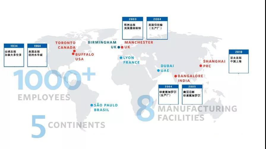 全球5大洲,5個大區總部,8個生產工廠,超過2000名員工。