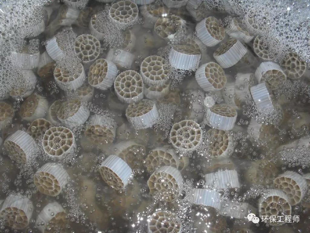 載體在水中的碰撞和剪切作用,使空氣氣泡更加細小,增加了氧氣的利用率。另外,每個載體內外均具有不同的生物種類,內部生長一些厭氧菌或兼氧菌,外部為好氧菌,這樣每個載體都為一個微型反應器,使硝化反應和反硝化反應同時存在,從而提高了處理效果。