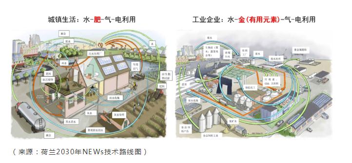 縱觀國際,諸如美國、加拿大、丹麥、英國、荷蘭、新加坡、德國、日本等發達國家,都是水處理行業創新比較活躍的代表,在碳中和體系下,這些國家圍繞相關的規劃、技術布局與創新、未來發展導向等做了大量工作。可以看出,很多典型的污水廠已經在向新生水源廠、有機肥廠、能源輸出工廠轉變。以荷蘭為例,其針對城鎮生活和工業廢水,建立了面向未來的污水處理資源/能源利用模式。