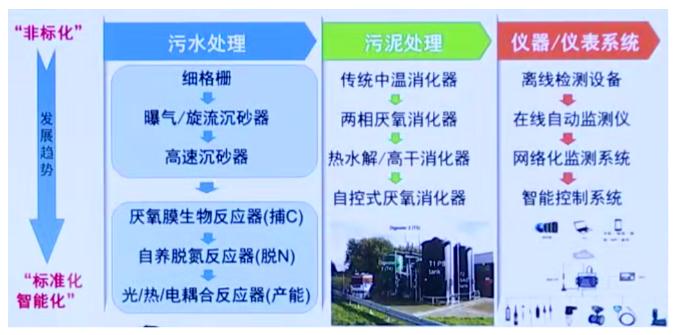 裝備是實施污水處理技術工藝實現的載體。污水處理廠從最前端的格柵到后面主體工藝的各種反應器,到污泥處理設備,包括整個流程智能控制的儀器儀表,都是實現碳中和不可忽視的內容。未來裝備的發展趨勢必然是從“非標化”逐步邁向“標準化”、“智能化”。