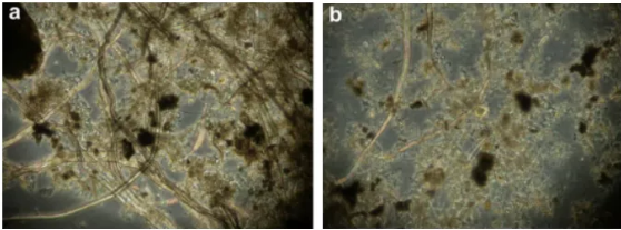 microscopic observation of fibres in settled material from raw influent(a) and fibres of settled material from sieved influent(b) sieve mesh 0.35mm,sieve rate 30 m3/(m2·h)