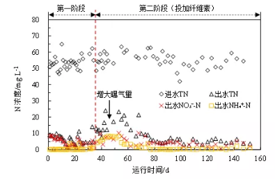 裝置采用連續流運行模式,根據進水有無纖維素分為兩階段,第一階段:0~35 d,無纖維素投加;第二階:36~160 d,投加纖維素。兩階段水力負荷均為0.83 l/(l?d),反應器污泥濃度(mlss)控制在3 500 mg/l左右,回流a、b、c分別為150%、300%、40%。污泥停留時間(srt)設定為10~20 d(根據實際情況進行調整);第一、二階段的污泥回流比(r)分別控制在100%和150%。其中,好氧池溶解氧(do)控制在2~5 mg/l,混合池根據出水水質靈活控制曝氣開關,第一階段和第二階段均未對混合池進行曝氣,其中do為0.1~0.2 mg/l。