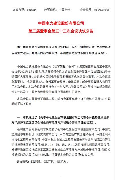 近日,中國電建發(fā)布公告稱,公司審議通過了《關(guān)于中電建生態(tài)環(huán)境集團有限公司聯(lián)合體投資建設國家海洋經(jīng)濟示范區(qū)靈昆全域生態(tài)環(huán)境導向產(chǎn)城融合開發(fā)項目的議案》。