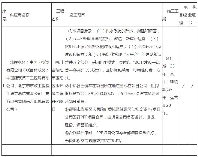 3月11日,四川省德陽市旌陽區(qū)水環(huán)境治理ppp項(xiàng)目采購結(jié)果確認(rèn)談判公示發(fā)布,中標(biāo)人為北控水務(wù)(中國)投資有限公司(聯(lián)合體成員:中國建筑第二工程局有限公司、北京市市政工程設(shè)計(jì)研究總院有限公司、東方電氣集團(tuán)東方電機(jī)有限公司)聯(lián)合體,中標(biāo)價(jià)為15590.26608萬元。